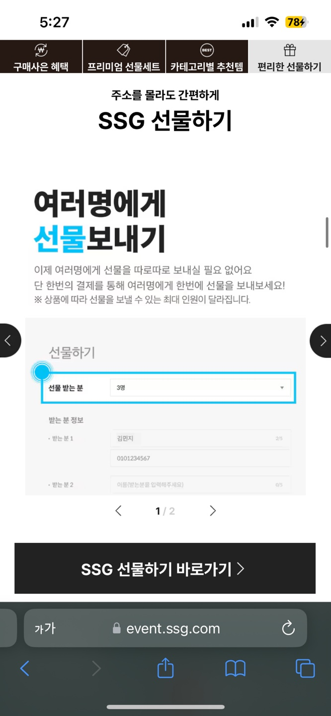 현재 ssg 선물하기는 여러명에게 선물을 보낼 수 있다고 합니다. 회사나 사업장을 운영하시는 분들에게 적합해 보이는데요.