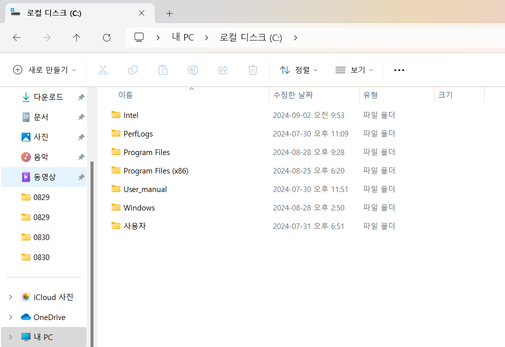 우선 내 PC에서 로컬 디스크 (C:)로 들어오셔야 합니다. 들어 오셨다면