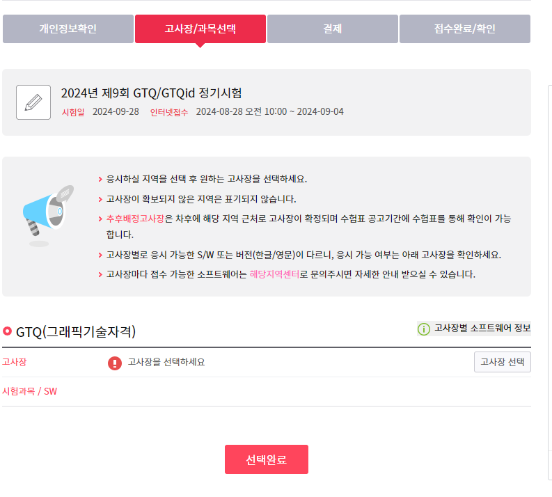 이후 고사장과 시험과목, 시간, 소프트웨어를 확인하여 선택하고 결제하시면