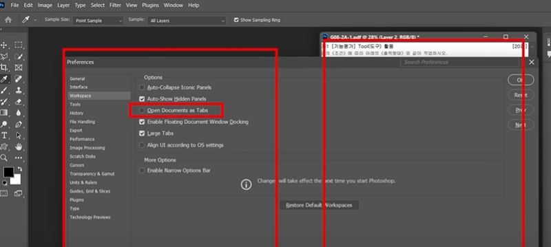 요거! 포토샵을 Tab 형식으로 볼 수 있도록 설정을 변경한 다음